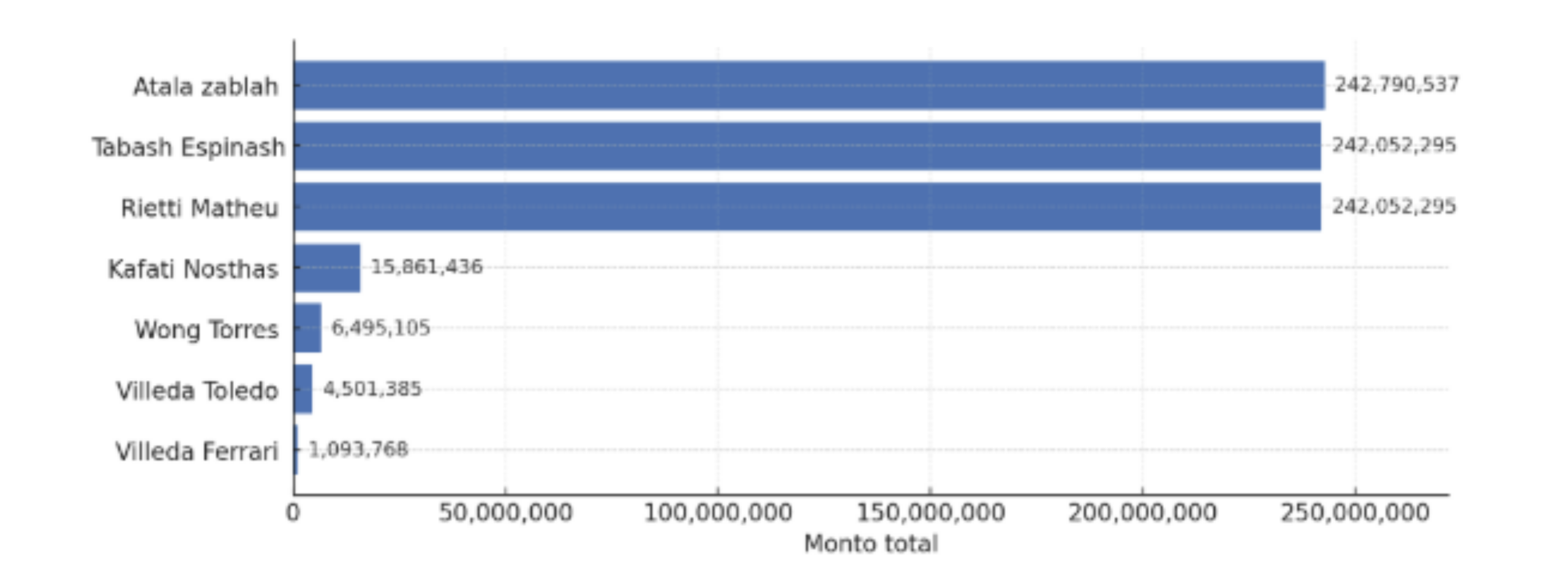 La gráfica muestra el monto total adjudicado por contratos estatales a distintas familias hondureñas, evidenciando una fuerte concentración en tres grupos: Atala Zablah, Tabash Espinash y Rietti Matheu, cada uno con más de 242 millones de lempiras. En contraste, otras familias como Kafati Nosthas, Wong Torres, Villeda Toledo y Villeda Ferrari recibieron montos considerablemente menores, desde alrededor de 15 millones hasta poco más de 1 millón. Esta distribución resalta la desproporción en el acceso a fondos públicos, concentrando la mayoría de los recursos en un reducido grupo empresarial.