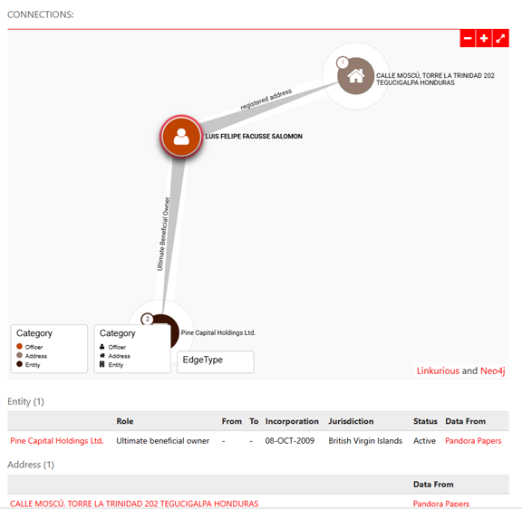 La figura de Luis Felipe Facussé también aparece en este rompecabezas. De acuerdo con registros corporativos citados por organizaciones de transparencia, desde octubre de 2009 controla un holding en las Islas Vírgenes Británicas llamado Pine Capital Holdings Ltd. La dirección declarada corresponde a un edificio de condominios en Tegucigalpa, lo que alimenta las sospechas de que se trate de una empresa de papel utilizada para mover capitales y optimizar el pago de impuestos fuera del país.